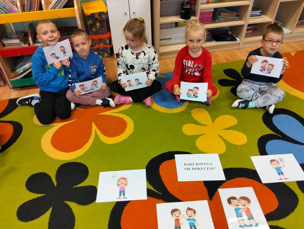 W czasie tygodnia dzieci pracowały z obrazkami przedstawiającymi zachowania życzliwe i negatywne. Zwracano uwagę na okazywanie empatii względem kolegów oraz pozytywne zachowania społeczne. Wyjaśniano także co oznacza dokuczanie oraz jakie mogą być jego skutki. Na koniec układały obrazki dzieląc je według zachowań pozytywnych oraz tych, którym mówimy "stop". Rozmawiały o tym, że każdy z nas jest wyjątkowy i wartościowy. bawiły się w gry integracyjne wiedząc, że uśmiech to najlepszy sposób na budowanie dobrych relacji