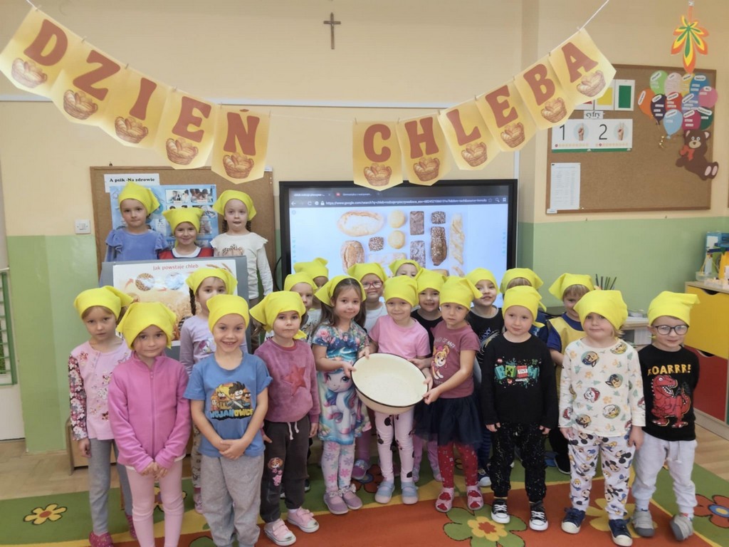 Dzieci poznały etapy powstawania chleba – od ziarenka zboża aż po gotowy bochenek na naszym stole. Dowiedziały się, skąd bierze się mąka, jak wygląda ziarno pszenicy oraz jakie są rodzaje chleba: pszenny, żytni, graham, razowy czy z ziarnami.