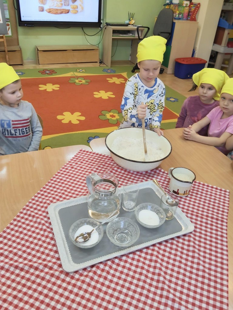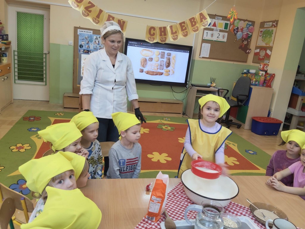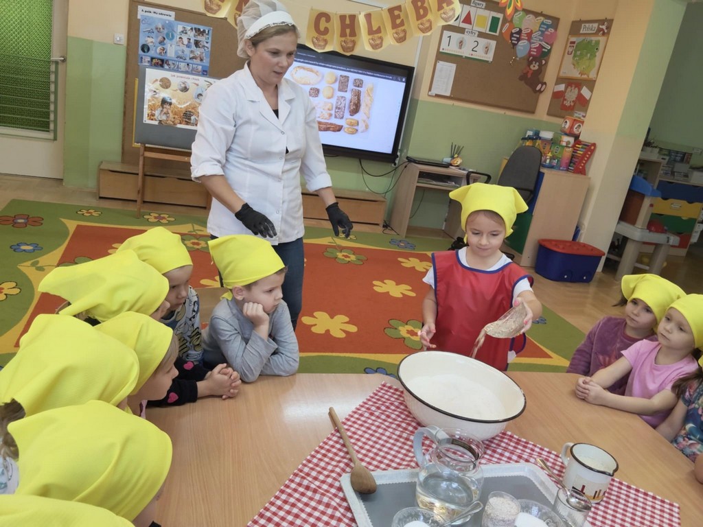 Największą atrakcją dnia było samodzielne pieczenie chleba. Przedszkolaki z zaangażowaniem mieszały składniki, obserwowały, jak ciasto rośnie, a potem z zachwytem wąchały zapach świeżo upieczonego bochenka. W piątek podczas śniadania ze smakiem zajadały się swoim wypiekiem.