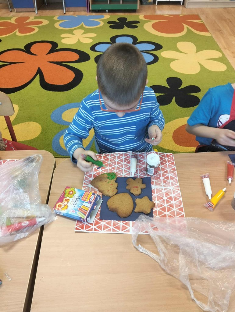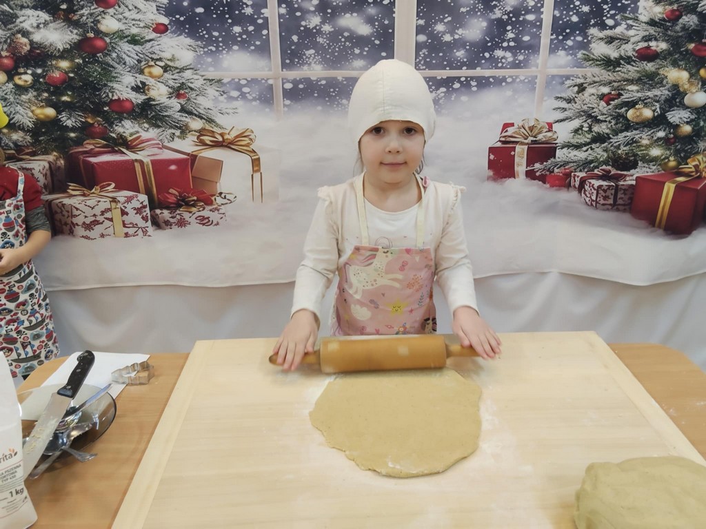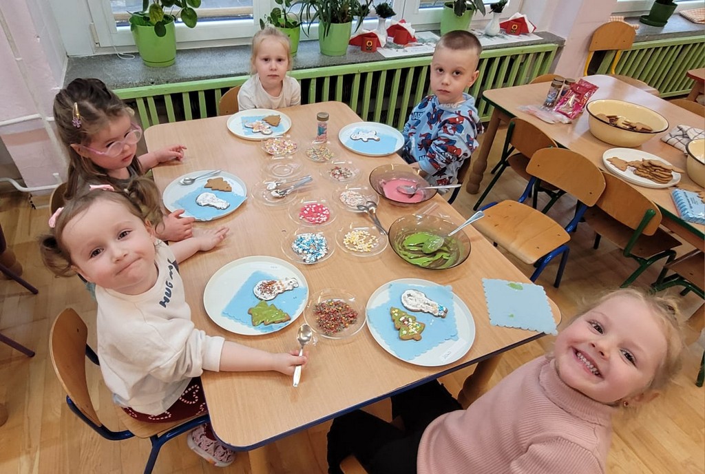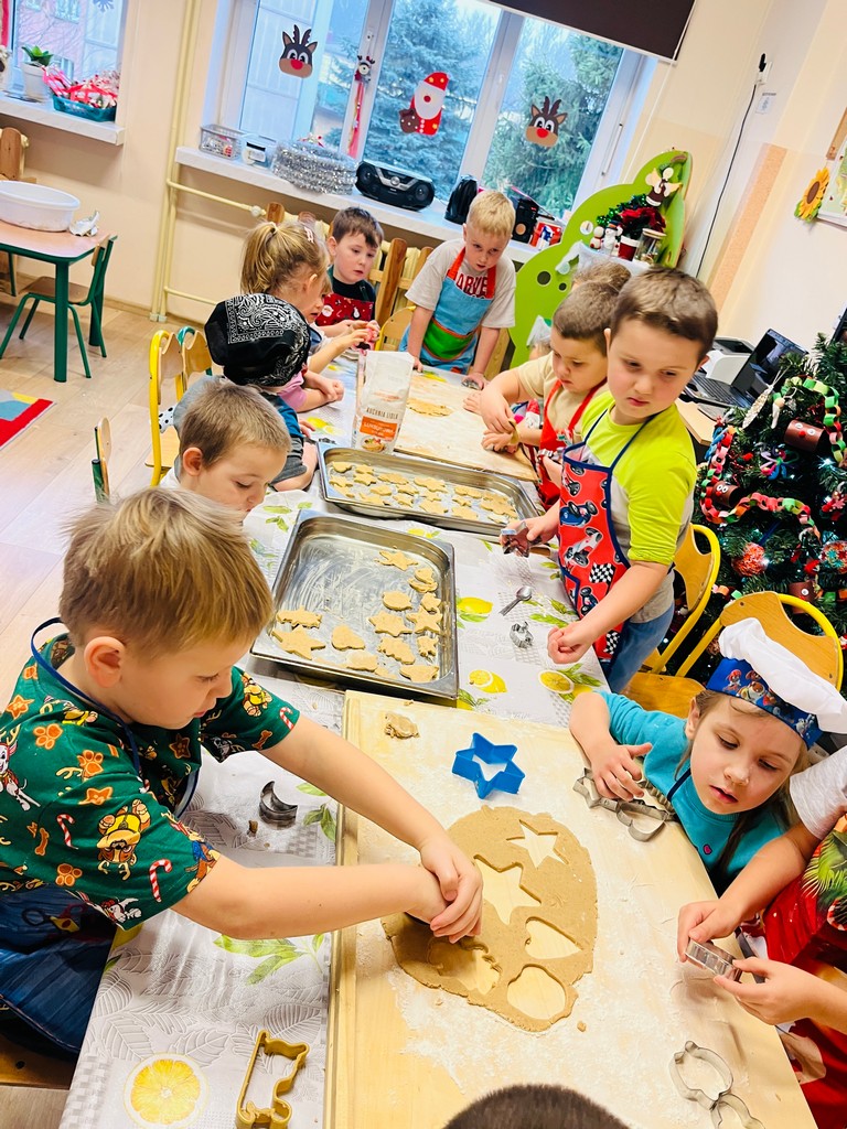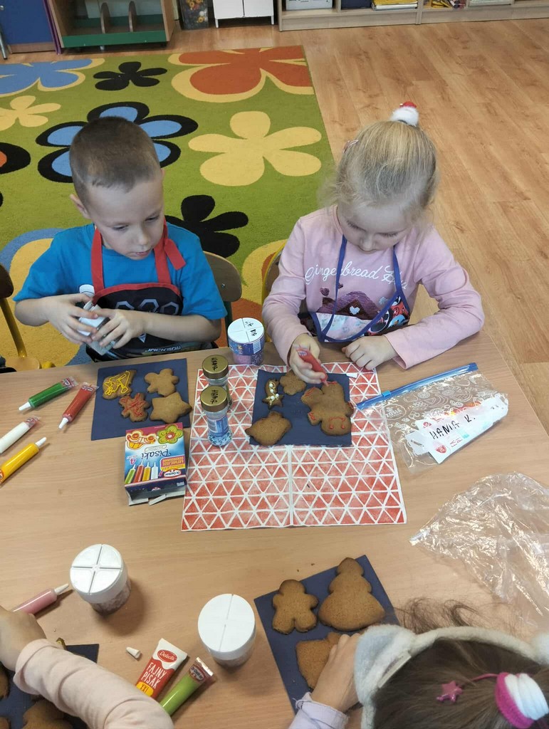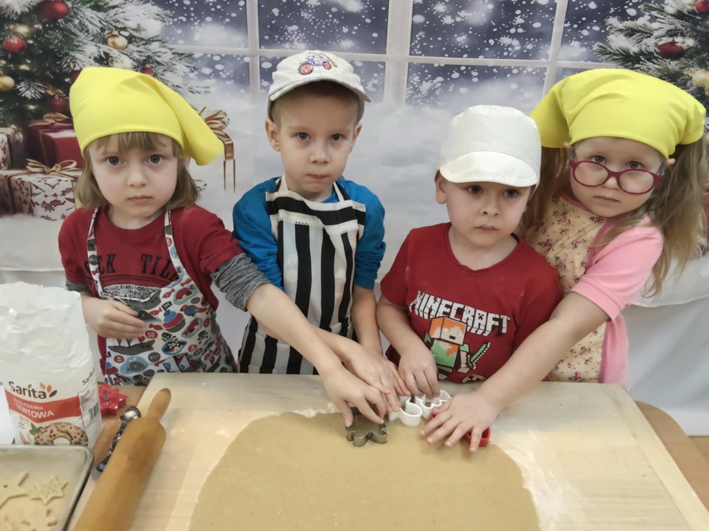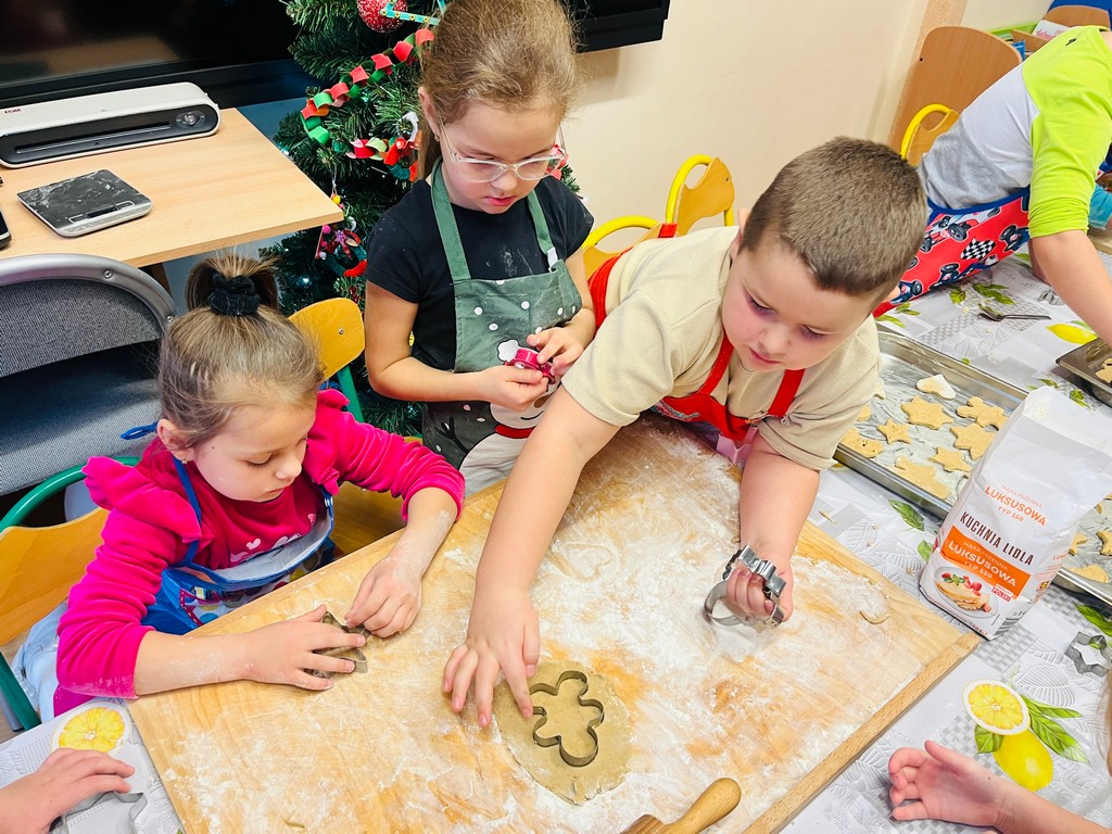 Przedszkolaki wałkowały ciasto, wykrawały pierniki w różnych kształtach oraz poznawały tajniki przygotowywania świątecznych wypieków. Nie zabrakło także dekorowania ciasteczek kolorowymi lukrami i posypkami.