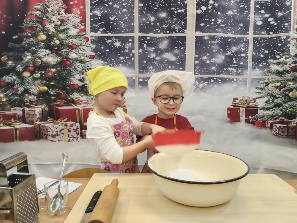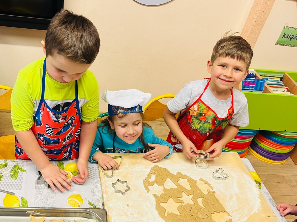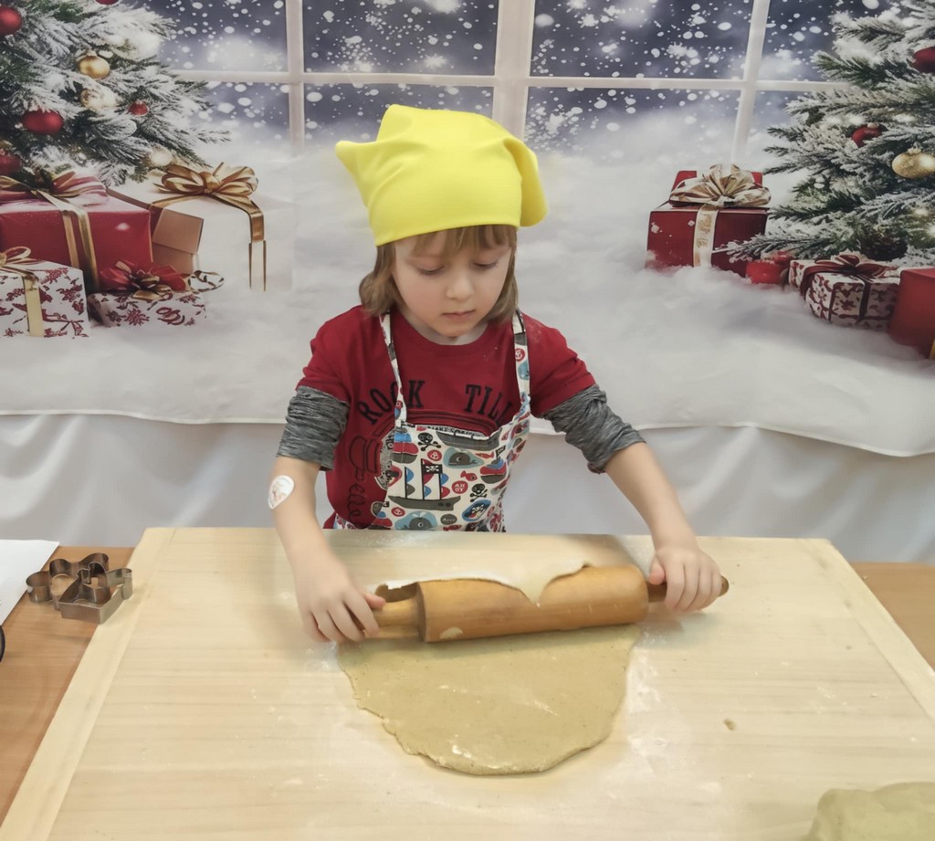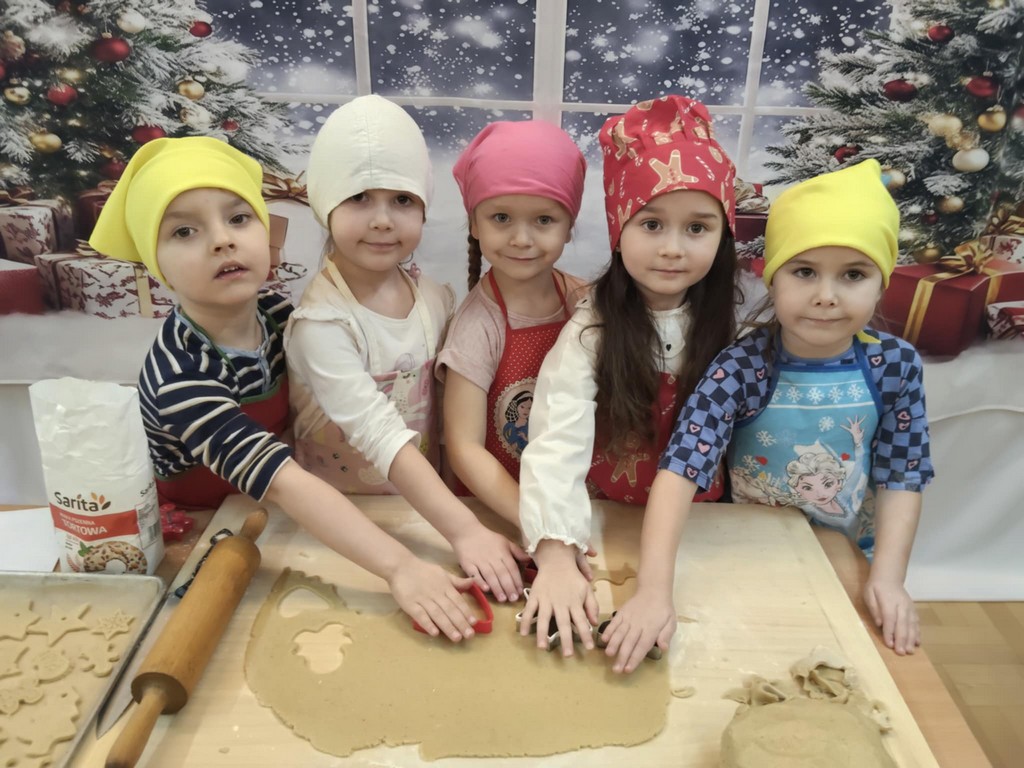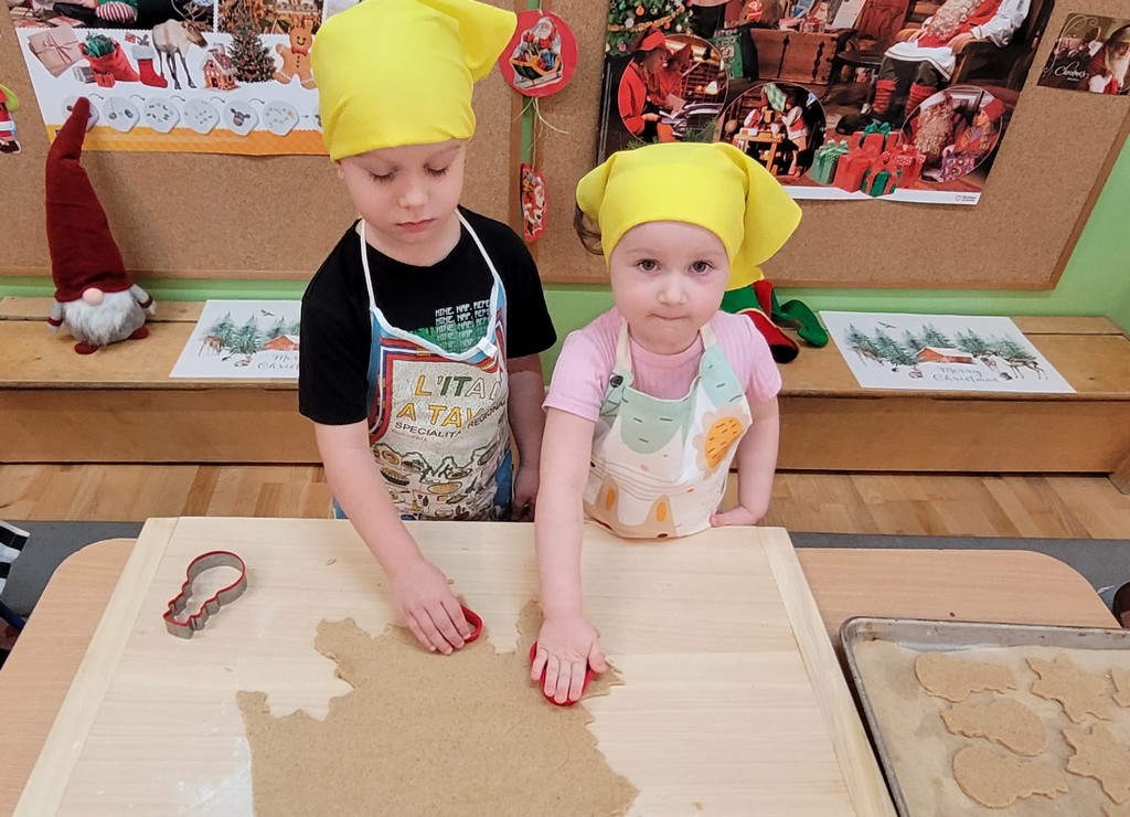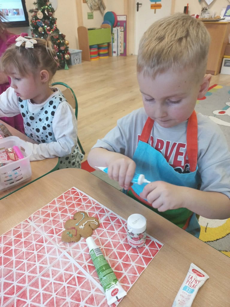 Przedszkolaki wałkowały ciasto, wykrawały pierniki w różnych kształtach oraz poznawały tajniki przygotowywania świątecznych wypieków. Nie zabrakło także dekorowania ciasteczek kolorowymi lukrami i posypkami.