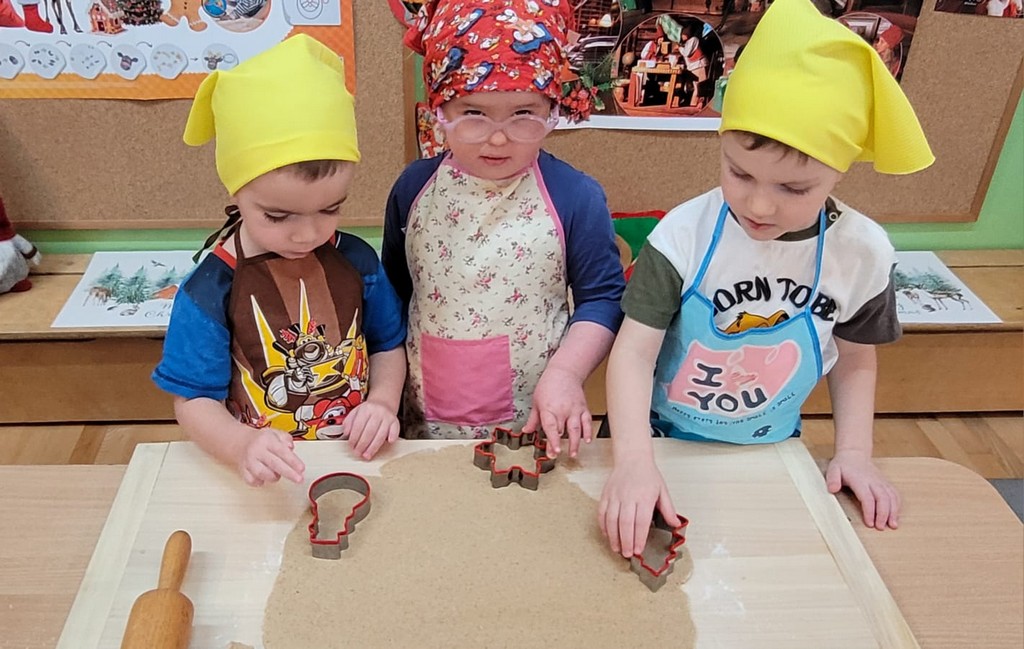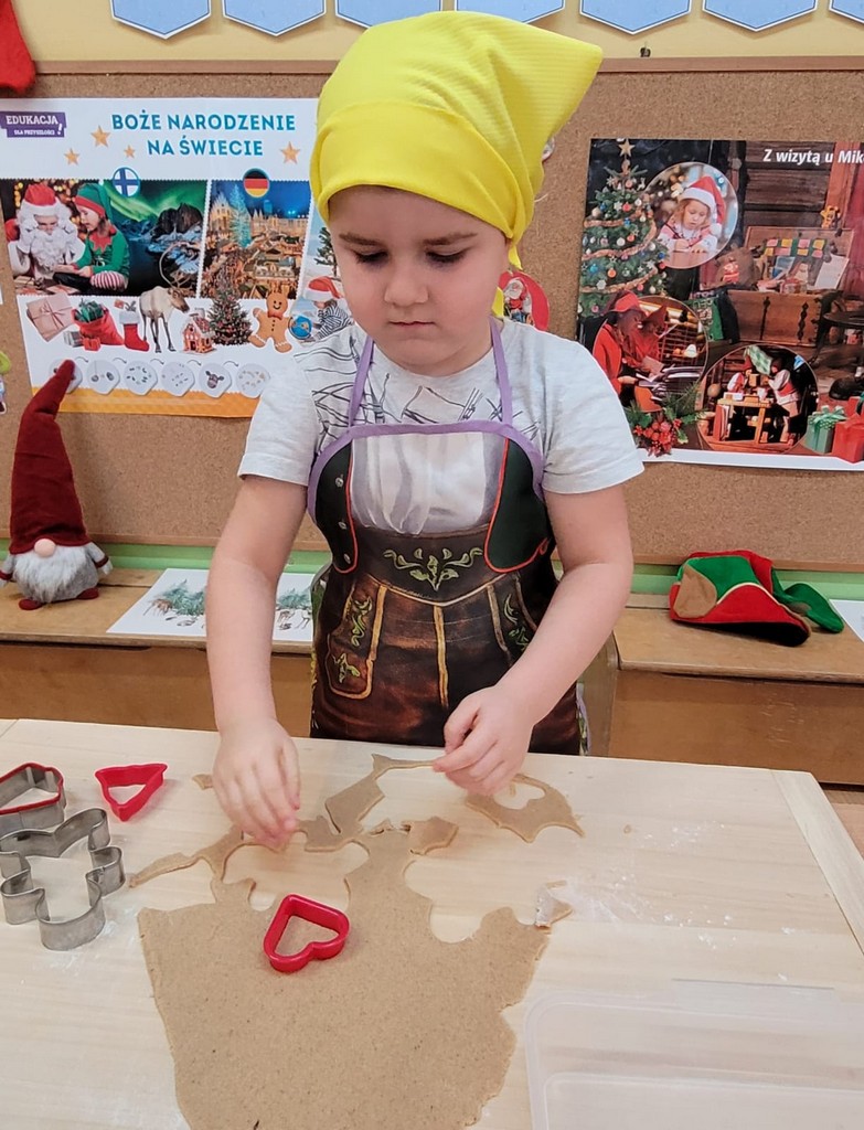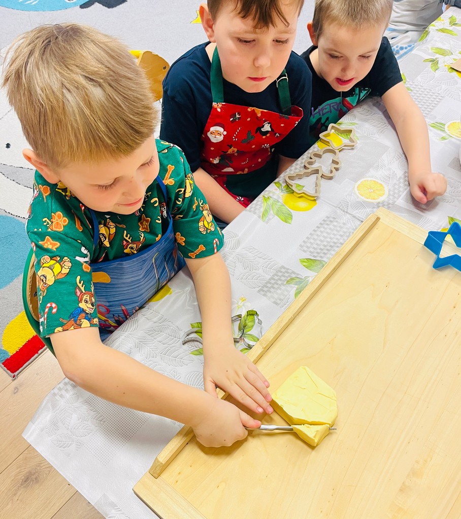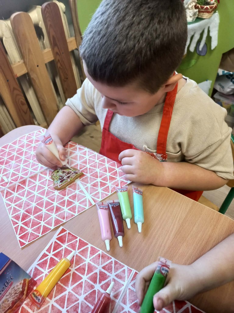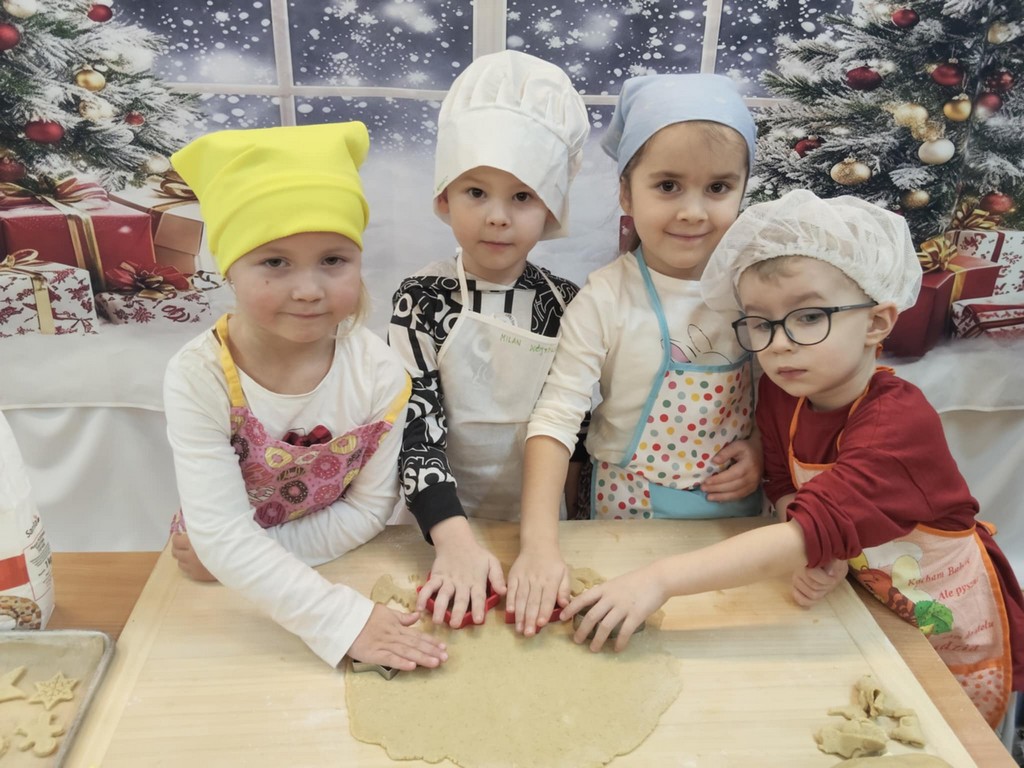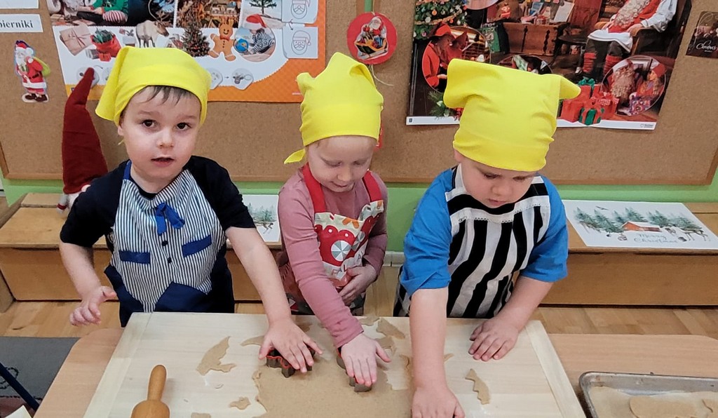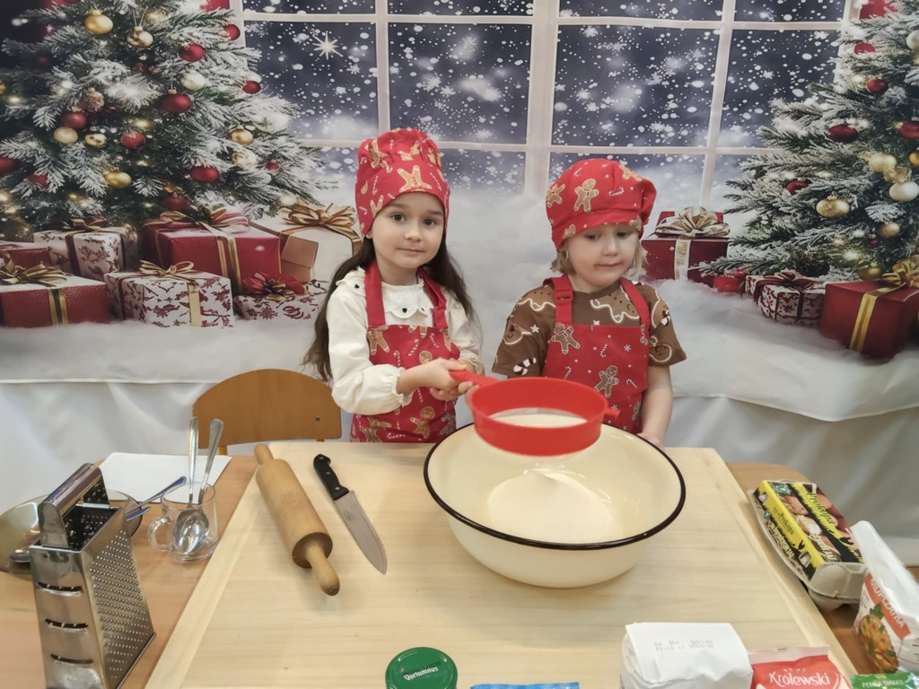Przedszkolaki wałkowały ciasto, wykrawały pierniki w różnych kształtach oraz poznawały tajniki przygotowywania świątecznych wypieków. Nie zabrakło także dekorowania ciasteczek kolorowymi lukrami i posypkami.