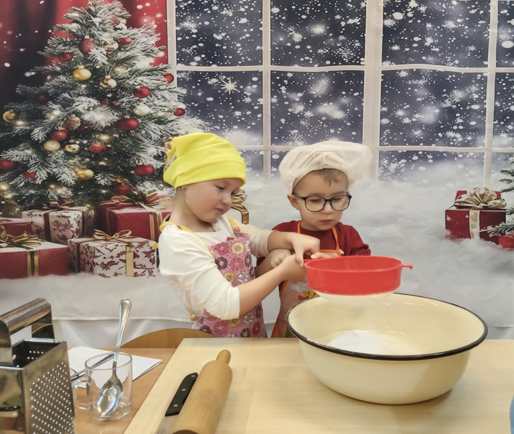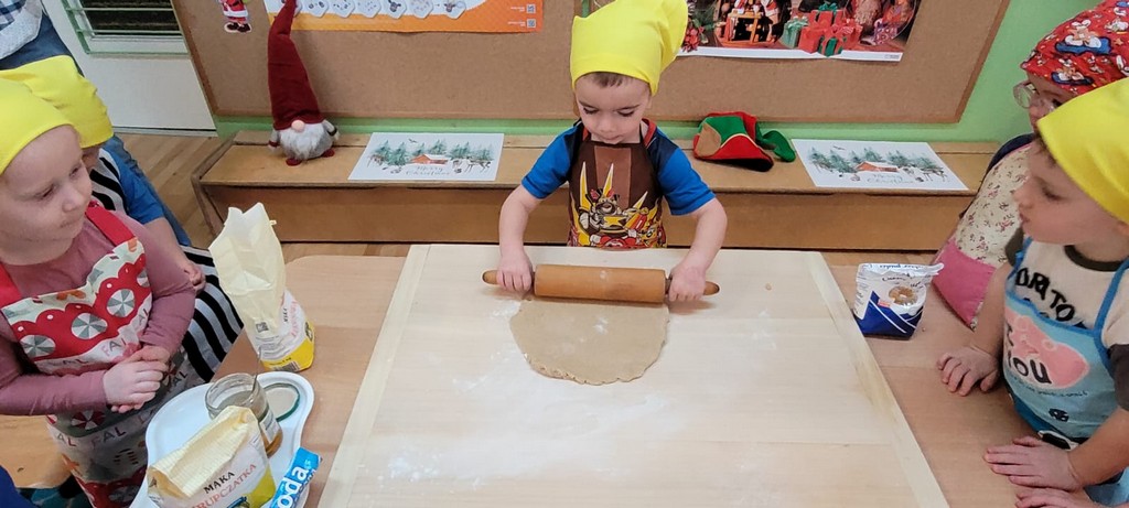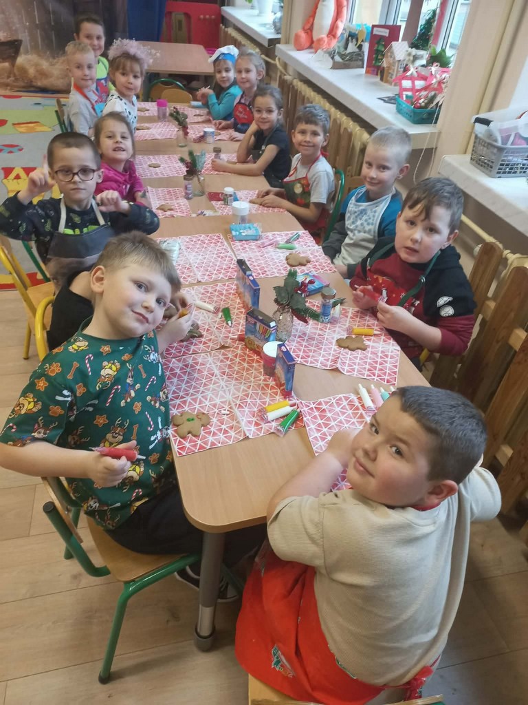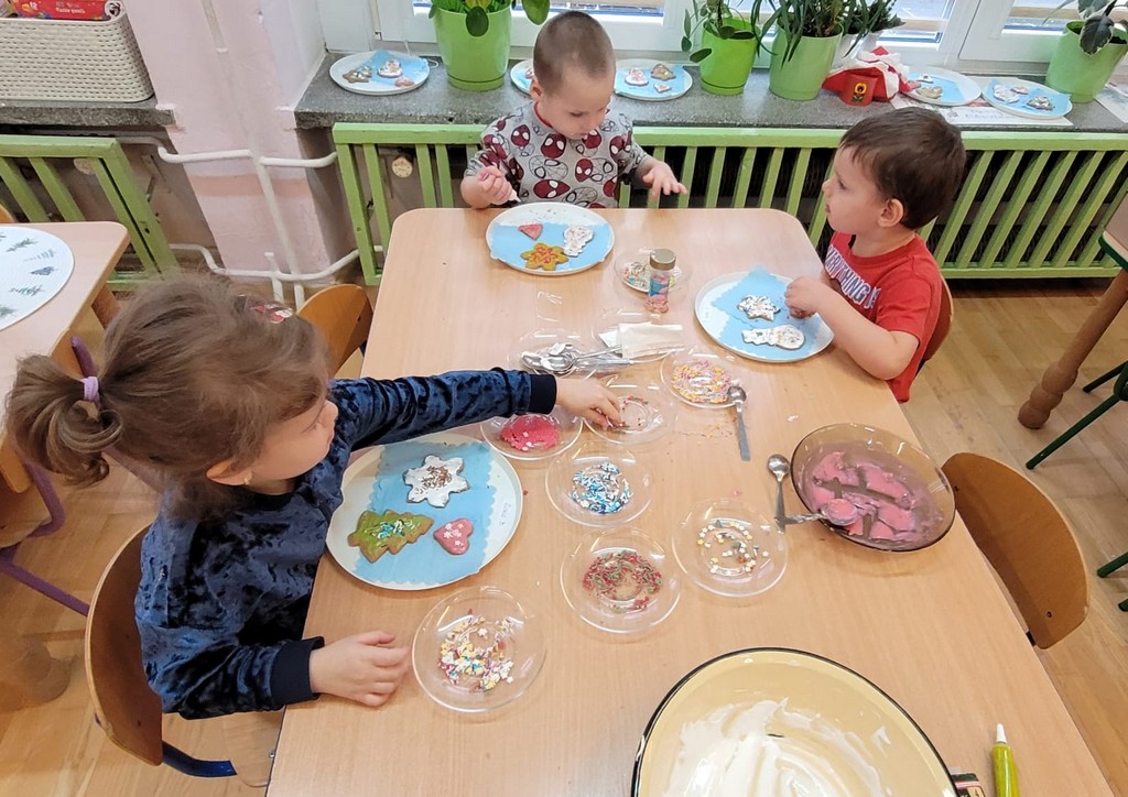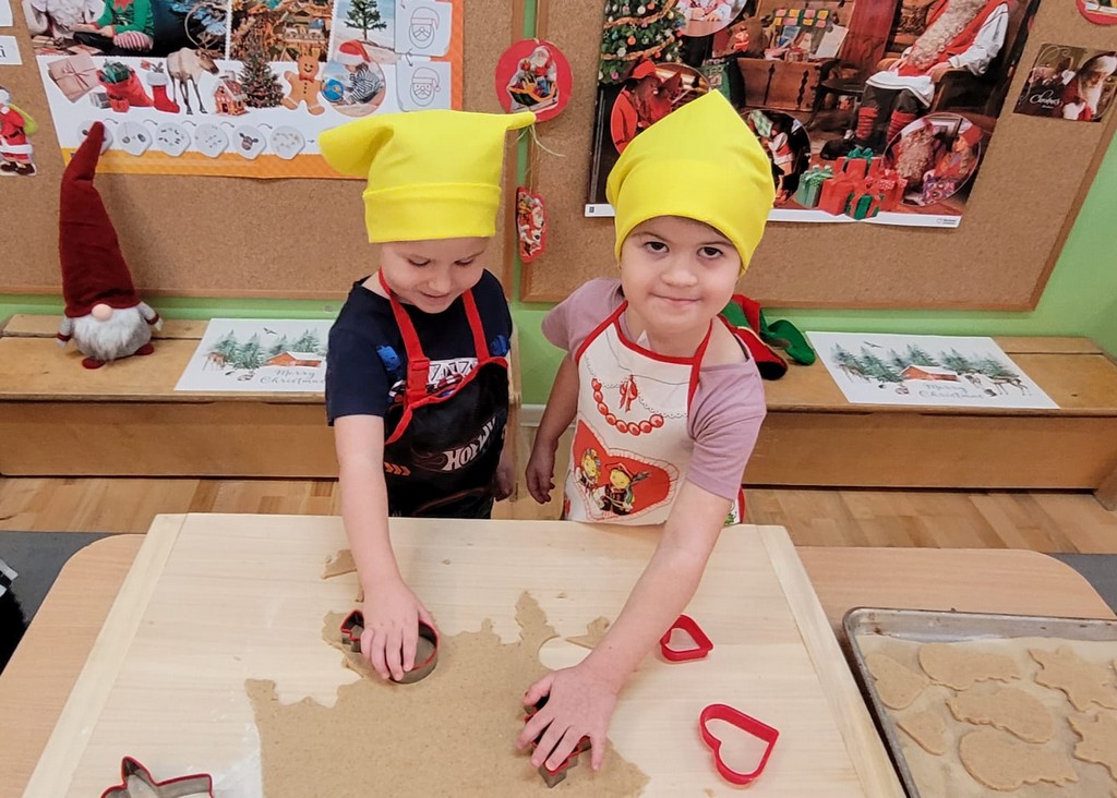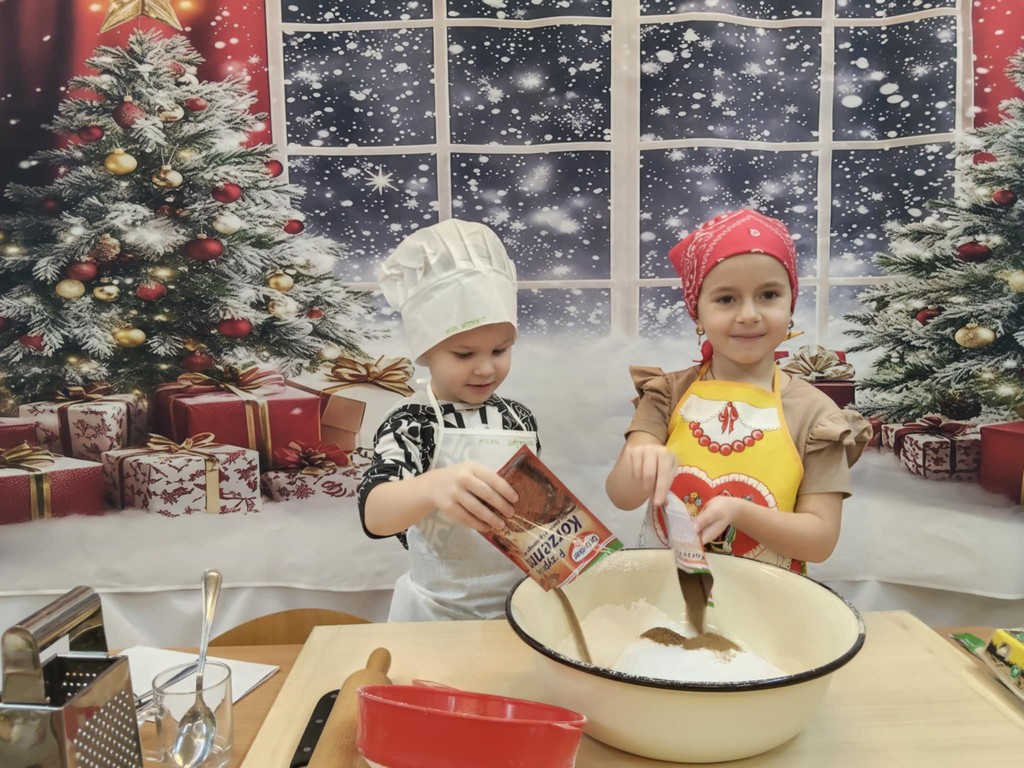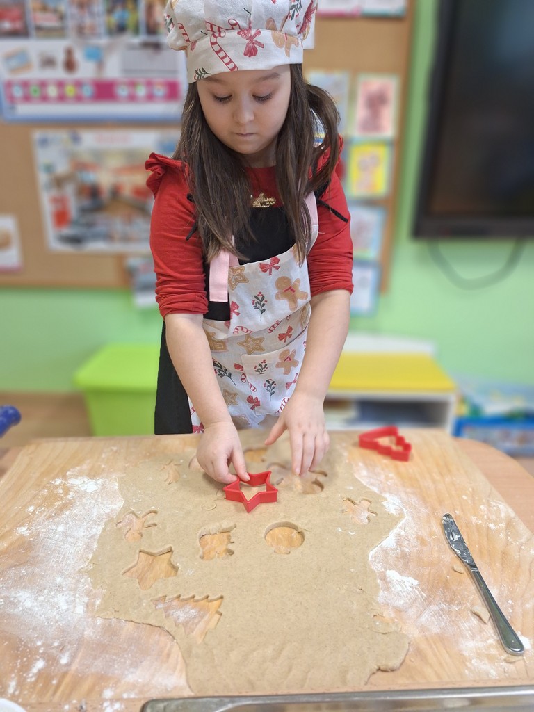 Przedszkolaki wałkowały ciasto, wykrawały pierniki w różnych kształtach oraz poznawały tajniki przygotowywania świątecznych wypieków. Nie zabrakło także dekorowania ciasteczek kolorowymi lukrami i posypkami.
