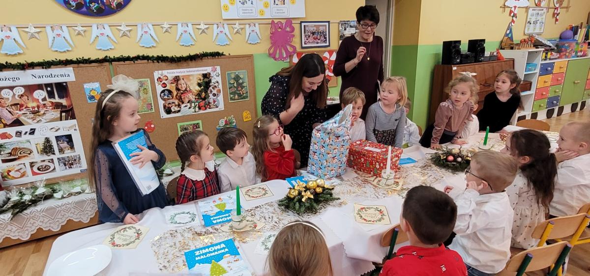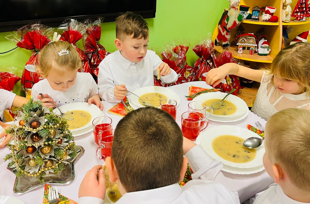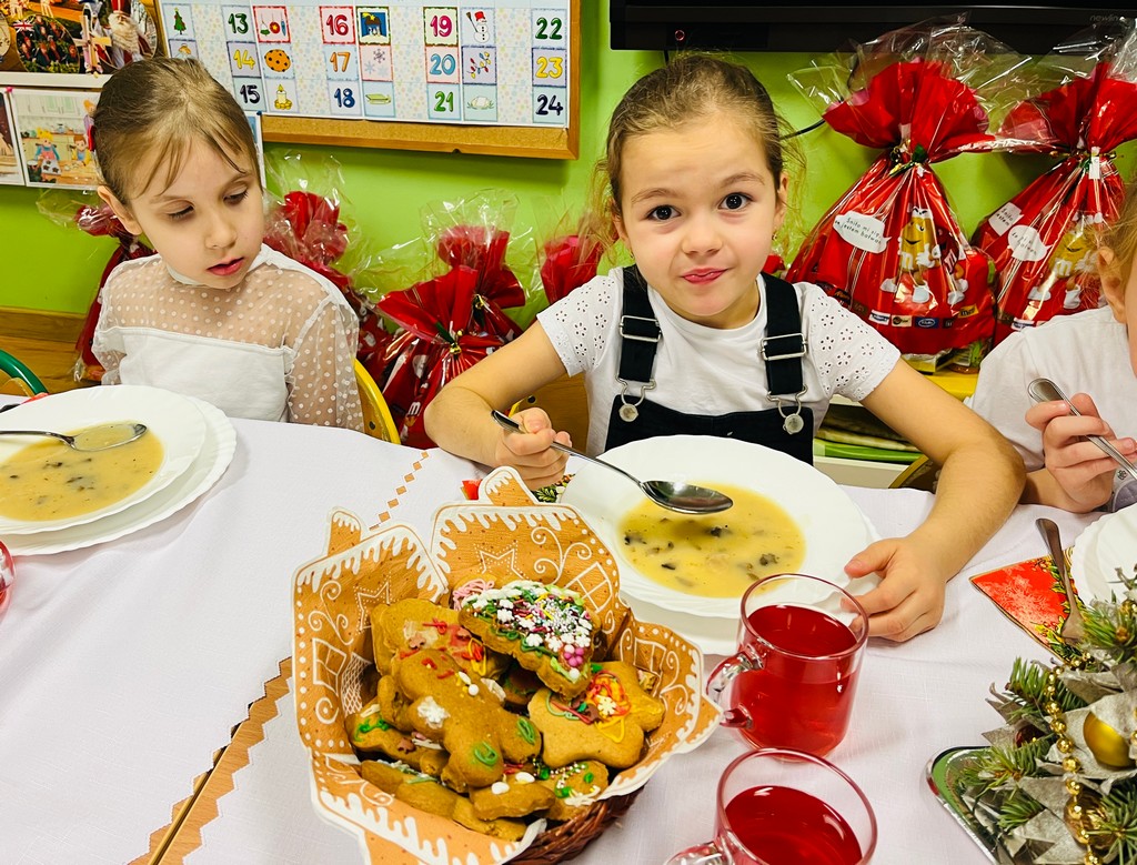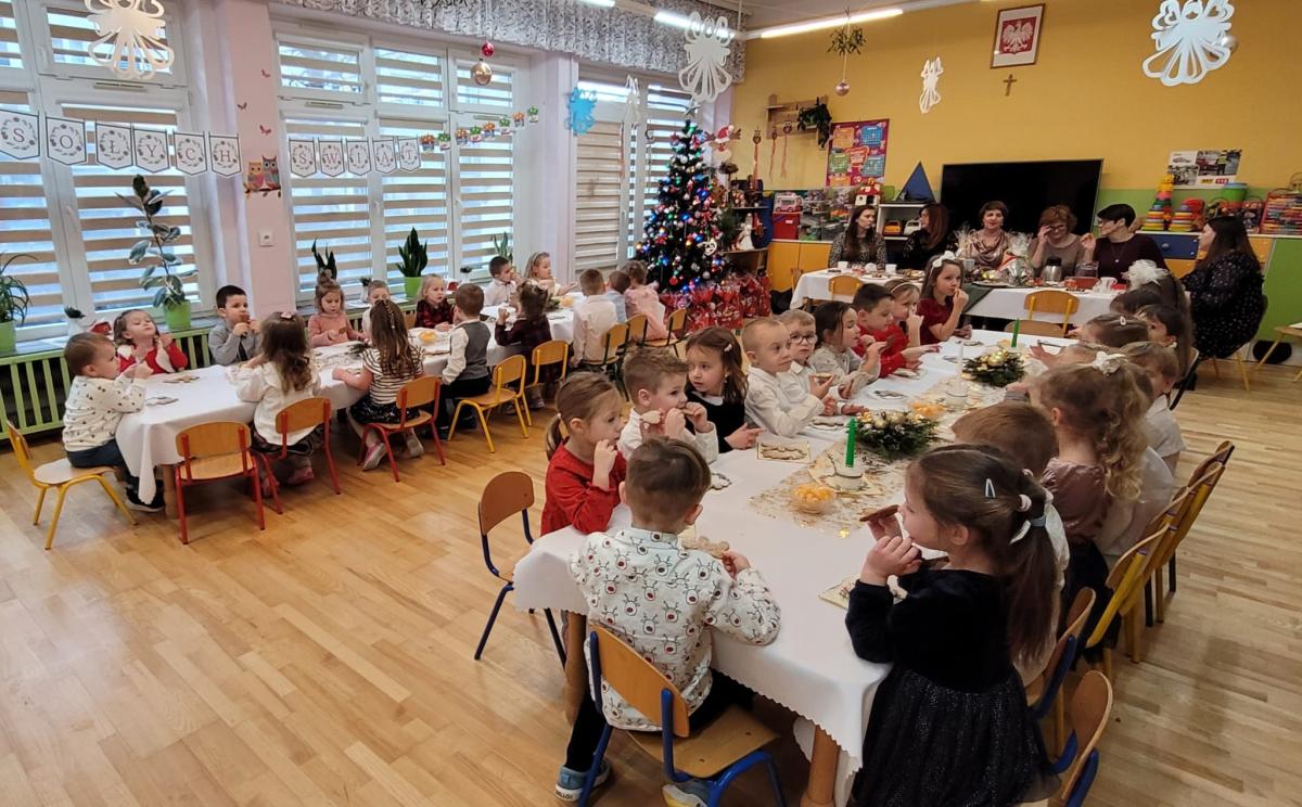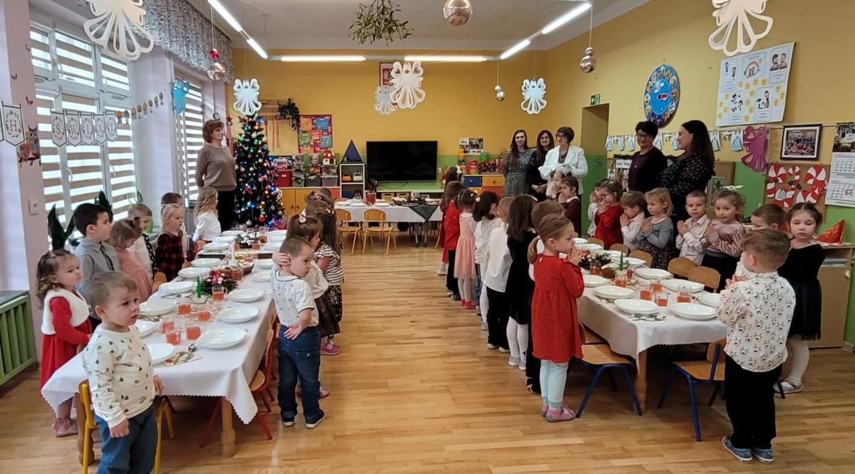 Najważniejszym momentem tygodnia była przedszkolna wigilia. Przy wspólnym, świątecznie udekorowanym stole dzieci dzieliły się opłatkiem, składały sobie życzenia oraz śpiewały kolędy. Towarzyszyła temu atmosfera życzliwości, bliskości i wzajemnego szacunku.