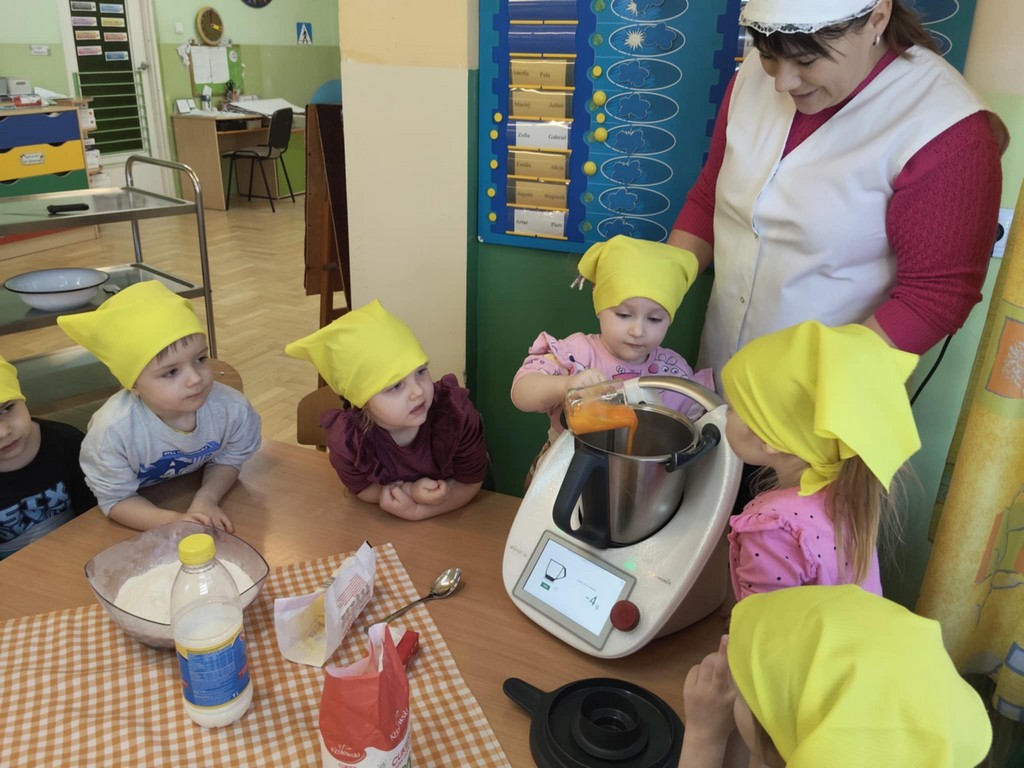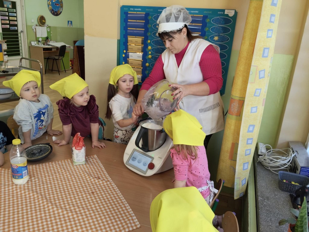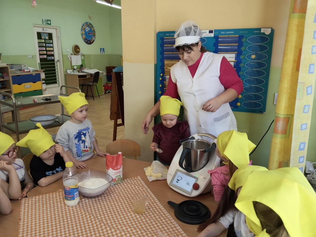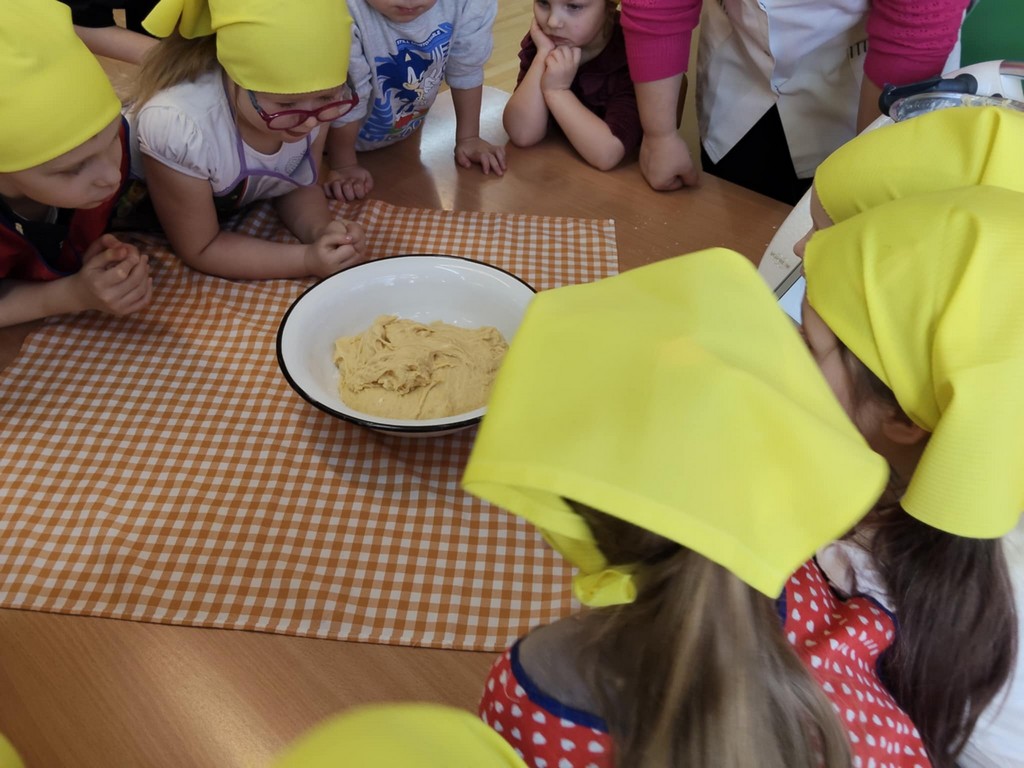 Tego dnia nasze przedszkolaki zamieniły się w prawdziwych małych cukierników! Dzieci uczestniczyły w przygotowaniu pączków od podstaw. Najpierw zapoznały się z potrzebnymi składnikami, a następnie samodzielnie odważały mąkę, cukier oraz inne produkty potrzebne do przygotowania ciasta. Była to doskonała okazja do nauki poprzez zabawę – dzieci ćwiczyły liczenie, rozwijały motorykę małą oraz uczyły się współpracy w grupie.