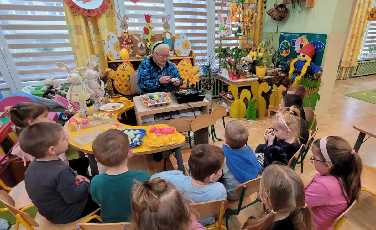 Naszym gościem w przedszkolu była ostatnio artystka ludowa specjalizująca się w tradycyjnym zdobieniu pisanek metodą batiku. Podczas wizyty opowiedziała o polskich zwyczajach wielkanocnych oraz o znaczeniu symboli i kolorów wykorzystywanych przy tworzeniu pisanek.